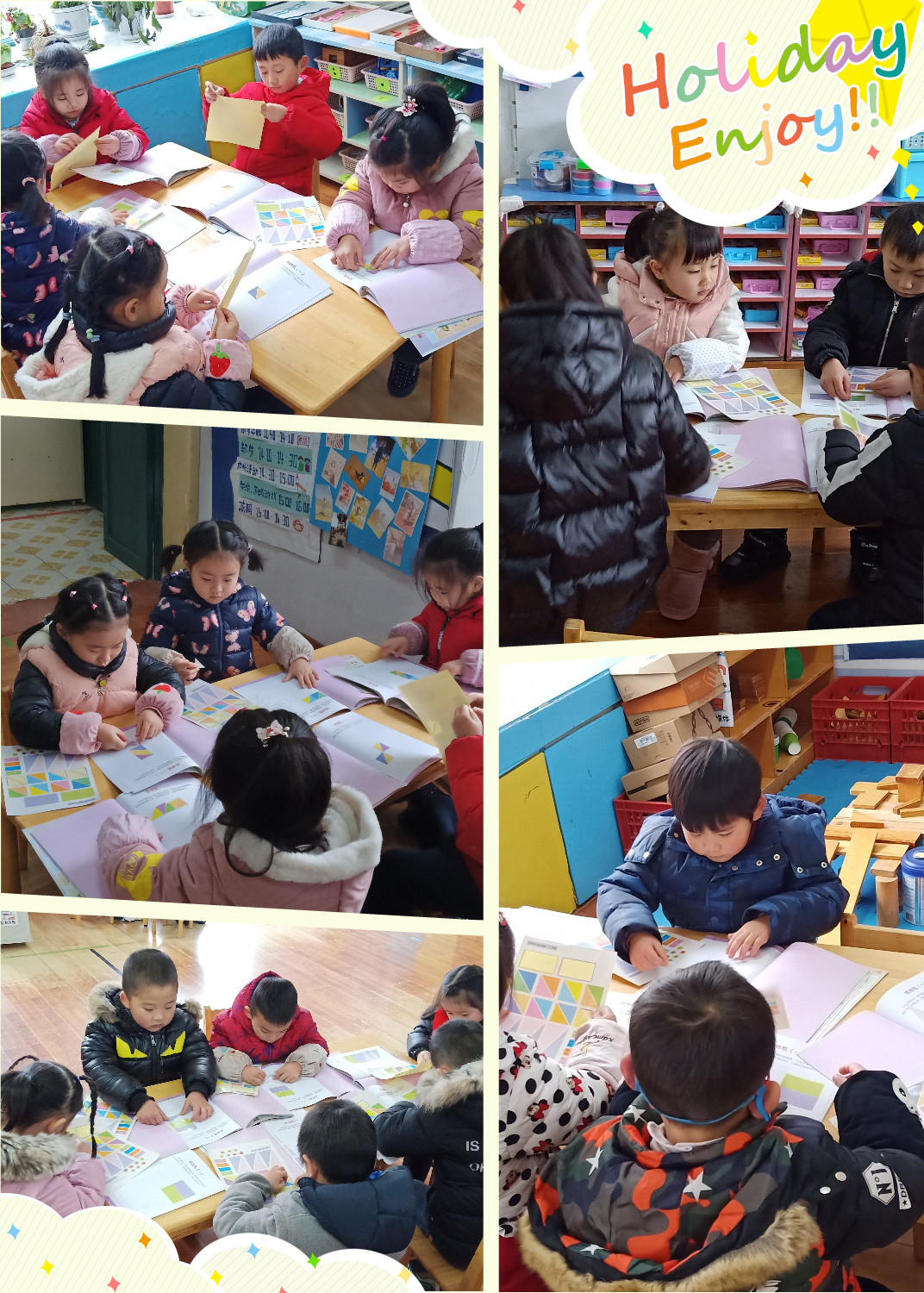 小兔子们遇到了一些小问题。天气渐渐冷了,他们需要一张大大的毛毯,这可怎么办呀?不过不用担心,瞧,我们聪明的小朋友正在聚精会神的帮助小兔子们拼地毯呢。认真的样子真可爱!